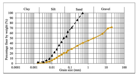 The investigated material comes from Illgraben catchments in Switzerland, where several floods are expected every year. The Illgraben catchment (10.4 km2) is located in the western part of Switzerland and extends from the summit of the Illhorn mountain (2716 m above sea level (asl)) to the fan apex (850 m asl) and to the outlet of the Illgraben into the River Rhone (610 m asl). A wide variety of flow types have been observed in Illgraben, ranging from granular to muddy debris flows, to hyperconcentrated flows and flood events [,]. Debris flows typically occur during intense summer thunderstorms from April to October. The tested material, which has been collected from the deposit areas along the channel, has a specific gravity of 2.633 and it is characterized by the presence of a coarse sediment fraction (80% sand-gravel and 20% silt-clay), as it is shown in Figure 1.