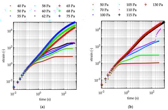 The experiments at imposed shear stress demonstrate that, corresponding to a shear stress higher than the threshold value, the mixtures behave as a conventional thixotropic mixture. In fact, viscosity decreases in time till it reaches a steady state constant value. For lower values of the imposed shear stress the mixture starts flowing, the strain initially increases (Figure 2), then the viscosity suddenly increases by several orders of magnitude (Figure 4), leading to a stoppage of the fluid. In this case, it is not possible to apply any equilibrium viscosity asset. In this sense the threshold shear stress value may be interpreted as a yield stress and the mixture may be considered as a yield stress fluid, and the flow like behavior of the mixture can be modeled as a generalized Herschel–Bulkley fluid, accounting for sediment concentration []. Indeed, the threshold stress value depends on sediment concentration, and creep test’s curves are qualitatively the same no matter the grain content.