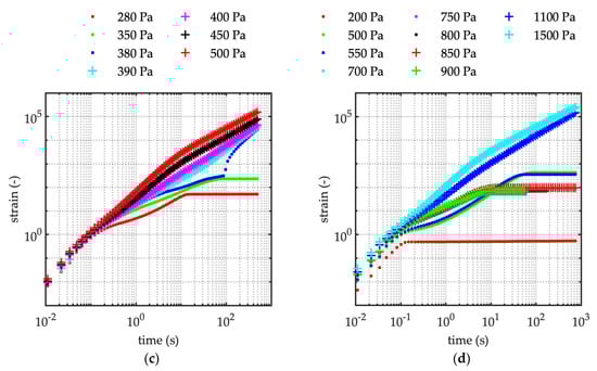 Creep tests. The time–strain trend during the test. (a) Sediment concentration C = 50%. Runs C87–C95 (see Table 2) corresponding to the increasing applied shear as it is reported in the legend. (b) Sediment concentration C = 52%. Runs C36–C42 (see Table 2) corresponding to the increasing applied shear as it is reported in the legend. (c) Sediment concentration C = 56%. Runs C59–C65 (see Table 2) corresponding to the increasing applied shear as it is reported in the legend. (d) Sediment concentration C = 58%. Runs C96–C104 and Run C108 (see Table 2) corresponding to the increasing applied shear as it is reported in the legend.