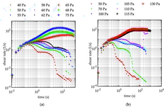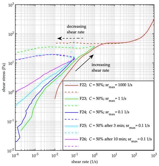 The measurement of shear stress depends on the applied initial shear rate, as it is evident in Figure 11 comparing the F22 and F23 tests. The viscous plateau occurs (see Figure 12) independently on the initial applied shear rate (i.e., runs F22, F23 and F24) as it was already observed by Jeon [], but it disappears as a consequence of aging due to a prolonged resting period.