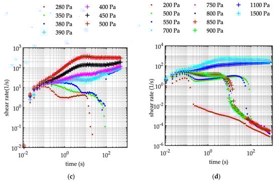 Coussot et al. [] already pointed out it would be in striking contrast with the theoretical yield stress fluid, since the steady state viscosity abruptly changes from infinity to a finite value at the critical stress stage. It is worth noting, according to the experiments carried out with imposed shear stress, the mixture always presents an instability when the shear stress approaches its critical value. Corresponding to applied stress lower than its critical value, the apparent viscosity always shows a minimum at time 10−1–100 s (Figure 4), and it is associated with a low shear rate, which results in two order of magnitude lower than the shear rate corresponding to the flowing steady state regime (Figure 3).