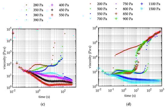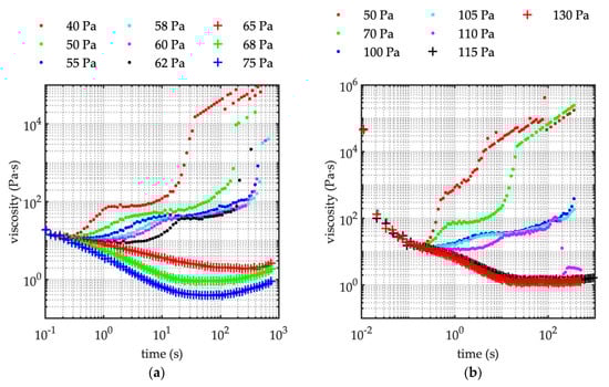 Noticeably, independent of the grain concentration, corresponding to the lower applied shear stress (i.e., lower than threshold value), the viscosity initially increases in a range of 101–102 Pa⋅s, than after a short-period time (typically 101 s), the slurry suddenly halts and the viscosity tends to an infinite value. For stress higher than the critical value, the viscosity reduces over a short period of time of about 101 s, then shows a constant value corresponding to the ultimate flowing steady state (Figure 3).