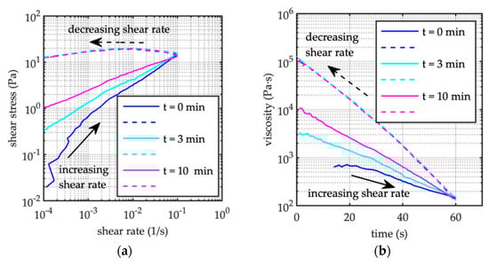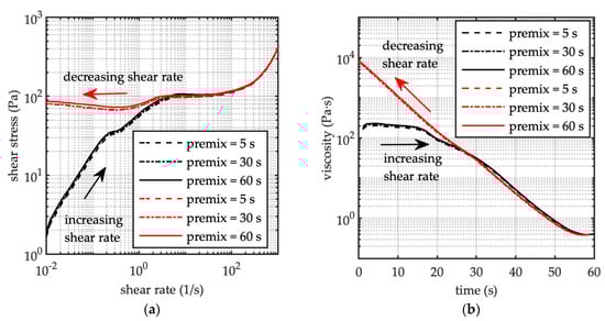 Consecutive flow tests have been carried out under rate-controlled mode, considering different premixing periods (i.e., 5, 30, 60 s) at a constant revolving speed (60 rpm), followed by a resting period of 5 s (i.e., tests F7, F8, and F9 see Table 1). Flow tests (Figure 5a) last 60 s during the increasing and decreasing shear ramp. Flow curves show a stress plateau, which is in fact an asymptotic case of the shear banding behavior []. In Figure 5b, for the sake of comprehension, the apparent viscosity is plotted as a function of the time, from 0 to 60 s (increasing ramp), and from 60 to 0 s (decreasing ramp). In every case the dynamic and static yield stress are the same, and the flow curves, corresponding to different premixing durations, overlap each other (see Figure 5a). It means that once the microstructure has been destroyed (after few seconds of pre-stirring), and the mixture does not have the possibility to experience an aging period, the mixture’s rheological behavior is the same, and it confirms the same viscosity evolution over time (Figure 5b).