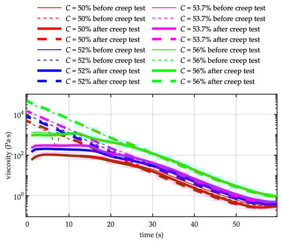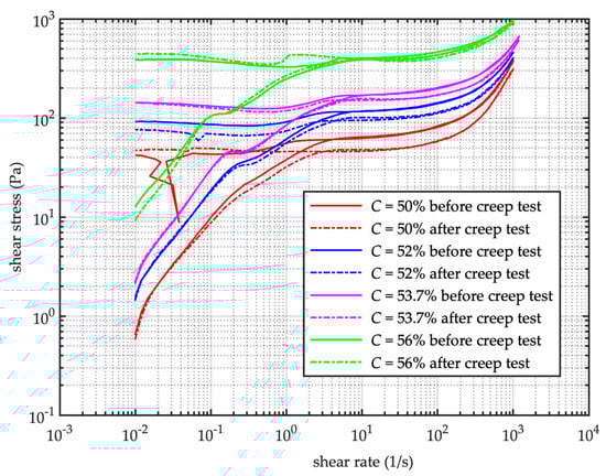 Nonetheless the stress–strain history of the mixture affects its rheological behavior. In fact, flow curve experiments alternated with creep tests (Figure 6) show different static and dynamic yield stress values, the difference being more relevant at lower grain concentration. The creep test affects the microstructure network and fosters the rejuvenation of the mixture, in fact the stress level is higher before than after creep test, and grain concentration enhanced the microstructure, reducing the effect of rejuvenation. On the contrary, the ultimate viscosity corresponding to the steady state fluid-like behavior remains the same for the tests carried out before and after creep tests, being the steady state viscosity value function of granular concentration (see Figure 7).