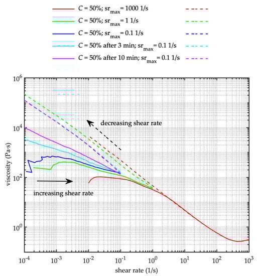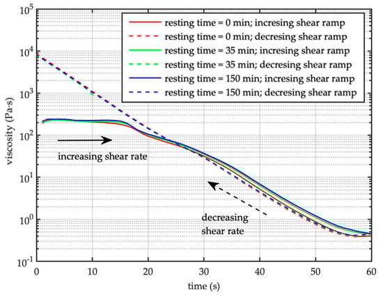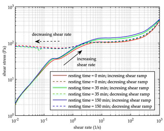 Long resting time very much affects the rheological behavior of the mixture in terms of static yield stress; on the contrary the dynamic yield stress almost remains the same independently of the resting period. Longer periods of rest make the rearrangement of the microstructure more effective, which is responsible of the abrupt change from stop to flowing, even because of the role of the gravity, despite the pre-stirring applied before starting the tests. The shearing flow tends to the same steady-state viscosity value (see Figure 9), independently of the resting period herein applied. After the microstructure has been destroyed during the flowing phase, decreasing the shear rate leads the mixture to experience the same aging and it results on the same dynamic yield stress, no matter the imposed resting period in the beginning of the experiments.