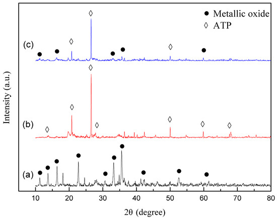 X-ray diffraction (XRD) patterns of (a) Fe-Mn-Cu, (b) ATP and (c) Fe-Mn-Cu@ATP.