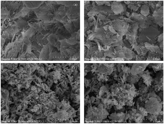 Figure 2a,b showed that the surface of the original ATP soil was relatively flat and smooth, with small rod-shaped particles and agglomeration, while the surface of the modified ATP soil had a convex sand dune shape and was irregularly distributed. Its particles were larger, the structure became loose, and the colloidal impurities in the ATP pores were effectively reduced by the modification method, which can avoid the agglomeration of crystal particles to a certain extent, and help the metal particles to be loaded on the surface. In addition, relevant studies have shown that the number of internal pores and specific surface area of ATP soil soaked by hydrochloric acid will increase, and all internal impurities can also be removed [26]. The decolorization and adsorption of ATP treated with acidification will be improved, which can play a better role in the process of environmental water treatment. In Figure 2c, the nano-polymetallic oxides showed some irregular appearance, and agglomerations caused by inter-metal forces were mainly dense. In Figure 2d it can be observed that, in the Fe-Mn-Cu metal oxide, particles on the surface of ATP and dispersed evenly between the layers (compared with Figure 2b), metal oxides, and acid modified ATP together led to the roughness of the samples increased, and particles on the surface of the ATP; a large amount of deposition may be due the process of synthesis of metallic bonding. At the same time, Fe-Mn-Cu metal oxide particles generated on the ATP surface have smaller and more uniform particle size, and show better dispersion and less coaggregation. Combined with XRD results, the composite catalyst was prepared successfully.