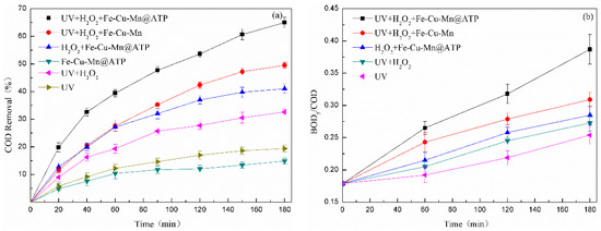 Different treatment methods were used to degrade the actual chemical pharmaceutical wastewater, and the COD removal rate is shown in Figure 3a. In the whole treatment process, the removal rate of COD is less than 15% after using catalyst adsorption or UV treatment alone. In addition, compared with the use of UV alone, adding oxidant can improve the COD removal by about 15%, but when adding multi-metal Fe-Mn-Cu oxide into the catalytic reaction system, the removal rate of COD can be significantly improved. Interestingly, ATP itself is not catalytic, and the removal effect of COD cannot be well improved. However, the COD removal rate of the composite catalyst catalytic system (UV/Fe-Mn-Cu@ATP/H2O2) was 64.9%, nearly 16% higher than that of the polymetallic catalytic system (UV/Fe-Mn-Cu/H2O2). The most likely reason is that nano polymetallic oxides are fixed and supported on the high surface area, which can not only prevent the accumulation of polymetallic oxides, but also prevent their loss to the water sample and improve their catalytic activity. So far, various materials have been applied to the carrier in the research process, such as graphene, activated carbon and bentonite [34,35]. Although they have a high external surface area and can help to remove COD through adsorption, their removal efficiency is still limited by the quality of wastewater and coulomb repulsive-force. Here, the acidified ATP was selected, and the surface of ATP was chemically functionalized to enhance its optimization potential and increase the formation density of •OH. ATP with high adsorption capacity and microporous structure is proved to be a low-cost carrier for the removal of pollutants from wastewater [27]. Therefore, the composite catalyst (Fe-Mn-Cu@ATP) has been shown to perform well in photo-Fenton catalytic oxidation.