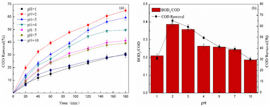 Effect of initial pH on (a) COD removal and (b) BOD5/COD of chemical pharmaceutical wastewater (Fe-Mn-Cu@ATP dose = 10.0 g/L, hydrogen peroxide concentration = 0.5 mol/L, light distance =20 cm).