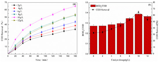 Effect of catalyst dosage on (a) COD removal and (b) BOD5/COD of pharmaceutical wastewater (initial pH = 2.0, hydrogen peroxide concentration = 0.5 mol/L, light distance =20 cm).