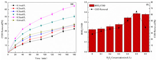 Effect of H2O2 concentration on (a) COD removal and (b) BOD5/COD of pharmaceutical wastewater (initial pH = 2.0, catalyst dosage = 10.0 mol/L, light distance = 20 cm).