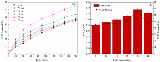 Effect of light distance on (a) COD removal and (b) BOD5/COD of pharmaceutical wastewater (initial pH = 2.0, hydrogen peroxide dosage = 0.5 mol/L, light distance = 20 cm).