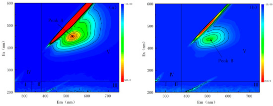 According to the literature research [44], the fluorescence spectrum can be divided into five major areas, which represent aromatic protein substances I(I), aromatic protein substances II(II), fulvic acid (FA) chemicals (III), soluble microbial metabolites (IV)and humic acid (HA) substances (V). It can be seen from Figure 8a that, before the reaction, there is obviously a major EEM peak in pharmaceutical wastewater: The peak A, at EX/EM of 450/525 nm, was labeled as HA substances. At this time, the complex component of FA and HA in wastewater was the largest. This indicated that the water sample was in a difficult state before pretreatment.