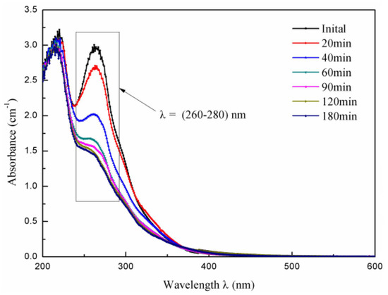 Figure 9 shows the change process of ultraviolet-visible (UV-vis) spectrum with photo-Fenton catalytic oxidation time. It can be observed that the shape and trend of UV-vis pattern at different processing times are similar, and the overall absorption intensity increases gradually with the decrease of wavelength. The initial spectrum has a very distinct shoulder around the wavelength of 270 nm. During the treatment, as the reaction time goes by, a significant decrease in absorbance can be observed, which was due to the oxidative degradation of the chromogenic part of the soluble organic compounds. This result is consistent with Ma’s previous research [30]. During the reaction process, •OH has a tendency to preferentially attack the organic part that was absorbed in the 260–280 nm wavelength range. After 180 min of UV/Fe-Mn-Cu@ATP/H2O2 catalytic oxidation reaction, the shoulder almost disappeared completely.