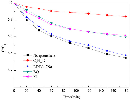 In order to study the mechanism of the Fe-Mn-Cu@ATP catalyzed photo-Fenton reaction system, a free radical quenching experiment was carried out. According to the literature reports, hydroxyl radicals (•OH) are the main active factors that play a role in the photo-Fenton system, and superoxide radicals (•) and holes (h+) are also common. Therefore, this experiment designed a capture experiment for hydroxyl radicals. During the reaction, tertiary butyl alcohol (C4H10O, capture of •OH), KI (capture of h+ and •OH), para-benquinone (BQ, capture of •) and ethylenediamine tetra-acetic acid disodium sodium (EDTA-2Na, capture of h+) were used as capture agents to detect free radicals in the reaction process. The results are shown in the Figure 10.