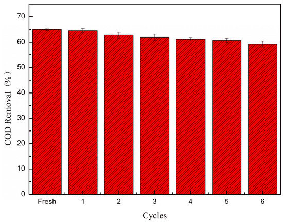 The stability of the recoverable catalyst is an important index to evaluate its performance. Therefore, the repeatability test was carried out after the recovery and retreatment of the catalyst in pharmaceutical wastewater. The catalyst was recovered through filtration and calcination. As shown in Figure 11, after six cycles of recycling, the catalyst still maintained its original catalytic activity and the COD removal was 59%. Compared with the first treatment, slight loss was observed, indicating that the prepared catalyst was of good stability. Different from the traditional binary ferrite, the catalyst has higher catalytic activity and cycling stability [50]. This work could provide a new research idea for the design of a photo-Fenton catalyst.