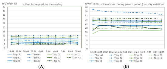 One-day data of soil moisture measured every two hours using the soil electromagnetic sensors, prior to the seeding (A) and during the growth period (B).