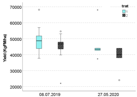 Higher differences were obtained in cob yield by treatment (T1: 10,230 kg/ha vs. T2: 6904 kg/ha in 2019 and T1: 5289 kg/ha vs. T2: 4867 kg/ha in 2020) than that observed in fresh mater. Thus, 33% higher cob yields were weighed in T1 vs. T2 in 2019 compared to a 14% increment in fresh matter. This fact must be taken into account when calculating water use efficiency.
