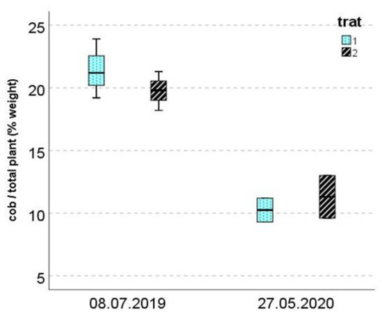 Ratio of cob/total plant weight (in %), calculated in both 2019 and 2020.