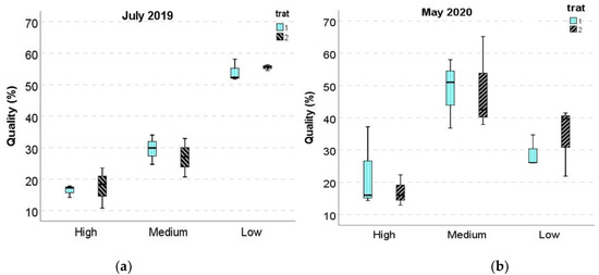 Box plot of cob quality expressed in % weight of each class respect to total weigh for each treatment and date (treatment •cob quality interaction was not significant). (a): data from the first harvest (2019) and (b): data from the second harvest (2020).