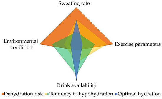 Traditionally, coaches tell athletes that thirst is not a good indicator of hydration status, because “once you’re thirsty, you’re already dehydrated”. The American College of Sport Medicine (ACSM), in their fluid replacement position stand, highlighted that “perception of thirst [...] cannot be used to provide complete restoration of water by sweating” and that “athletes should start drinking early and at regular intervals [...] or consume the maximal amount that can be tolerated” [7]. ACSM suggested for athletes a water intake plan of about 500 mL of fluids 2 h before exercise, followed by an interval hydration during exercise every 15–20 min, especially in ultra-endurance sports at high humidity and temperature. Indeed, a condition of water deficit negatively impacts sport performances. Therefore, customizing a drinking plan for athletes means preventing dehydration during physical activity and restoring the initial hydration status in the post-exercise recovery [8,9,10]. Environmental conditions influence exercise capacity and athlete performance. When preparing a competition, athletes and their technical staff must consider meteorological factors as temperature and humidity, indoor or outdoor field.