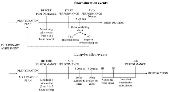 This preliminary assessment is followed by the prehydration plan, that essentially consists in the water intake the day of performance, starting from some hours before. As said, the aim of prehydration is to start performance without excess or lack of water and electrolytes, in view of the upcoming physical effort. Adjusting the water intake according to urine volume is sufficient for short-duration events, but not for the long-duration performances, for which evidences suggest the addition of an acclimation protocol [47,48]. According to the guidelines [27], the fluid balance can be preserved during performance with an interval hydration (every 15–20 min). Therefore, short-duration events (up to 30 min) are hypothetically characterized by only one “drink availability check” or time out. It is more likely that short-duration events do not include drinking breaks or time outs, whereas long-duration performances likely do. However, as also reported by Holland et al. (2017) [46], for performances lasting less than 1-h, small rates of water intake assessed according to the individual rate of gastrointestinal absorption are suggested. In any case and especially for team sports and competition with breaks as per regulation (middle-distance events, long-duration events with time out), the “drink availability check” should be always estimated before performance to implement both prehydration and rehydration plans.