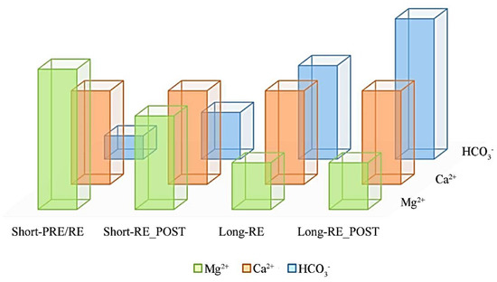 Natural Mineral Spring Waters composition before, during and after short- and long- duration sport events. The relative distribution of magnesium, calcium, and bicarbonate is reported for a qualitative evaluation of the best composition of the waters. Short-PRE/RE = prehydration/rehydration before/during short-duration events; Short-RE_POST = rehydration post-exercise (recovery time) in short-duration events; Long-RE = rehydration during long-duration events; Long-RE_POST = rehydration post-exercise (recovery time) in long-duration events; Mg2+ = magnesium; Ca2+ = calcium; HCO3− = bicarbonate.