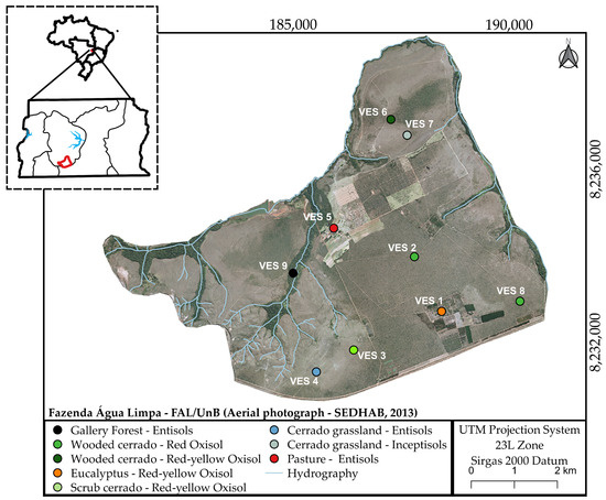 The study area was the Fazenda Água Limpa (FAL), which is the University of Brasilia experimental farm, located in the southern portion of the Distrito Federal, Brazil (8,229,000 to 8,238,000 UTM N and 180,000 to 190,000 UTM E, SIRGAS 2000 Datum) (Figure 1). The climate in the study area is tropical Aw, defined by Koppen as typical of savannah, with monthly average temperature and evapotranspiration equal to 22 °C and 65 mm, respectively, and annual precipitation of approximately 1500 mm distributed between October and March [37,38].