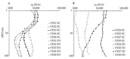 Initially, VES data were automatically inverted, using a variant of the Newton algorithm [50] (Figure S1). This inversion provided the parameters for building the initial geoelectric model (resistivity, ρ, and thickness, h, of the geoelectric layers) by fitting a synthetic curve to the field curve. As the fit objective function, we inimized the Mean Absolute Percentage Error (MAPE) (Equation (1)) between field () and synthetic () data [50,51].