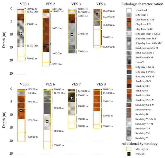 Regarding the identification of the aquifer, in VES 2, 4, 5, 6, and 7, the transition from layers with a high resistivity value to layers with reduced resistivity was approximated to the position of the water table (Figure 3). In the other vertical electrical sounding (VES) stations, although geophysical-lithological models does not indicate the exact depth of groundwater, the WTL was placed in layers with reduced electrical resistivity (Figure 3).