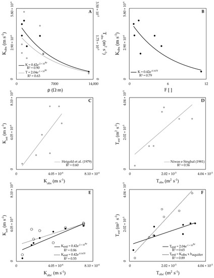 Relationship between geoelectric and hydraulic parameters in a porous aquifer. (A) Hydraulic conductivity (Kobs) and transmissivity (Tobs) values, obtained by slug test, as a function of the electrical resistivity values of the aquifer (ρaquifer). (B) Kobs as a function of the aquifer formation factor (F). (C) Comparison between the estimated hydraulic conductivity values (Kest), according to Heigold et al. (1979) [24], and Kobs. (D) Comparison between the estimated transmissivity values (Test), according to Niwas e Singhal (1981) [8], and Tobs. (E) Comparison between the estimated hydraulic conductivity values (Kobs’), according to Heigold et al. (1979) [24], and Kest with equations presented in Figure 4A,B. (F) Comparison between the estimated transmissivity values (Tobs’), according to Niwas e Singhal (1981) [8], and Test by equation in Figure 4A and Kobs × haquifer.