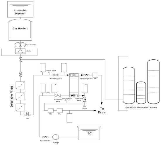 Biogas (CO2: 34%–39%) produced on-site at an anaerobic digester was redirected from the primary biogas pipeline to the HFMC system post chiller (Figure 1) and gas booster, which removed ‘free water’ from the gas phase and increased gas pressure to 75 mBar. Due to the low gas pressure following prefiltration (<60 mBar), the gas flow rate was maintained using an inline double-acting flow control valve (F.lli Tognella Spa, Rome, Italy) and manually corrected according to the inlet ST75V Mass Flow Meter (3.4–30 L min−1, error ± 1.5, Fluid Components International LLC., San Marcos, CA, USA). Gas prefiltration was achieved using VACU-GUARD 150 (Whatman International Ltd., Maidstone, UK) inline filters comprised of activated carbon/PTFE membrane (AC) for particulate and siloxane removal, anhydrous calcium sulphate/PTFE membrane (ACS) for gas drying and Silica-Alumina zeolite/PTFE membrane (SAZ) as a molecular sieve. Gas and liquid pressure were measured using PX319 series pressure transducers (0–10 BarG, Omega Engineering Ltd., Manchester, UK). Unfiltered or prefiltered biogas flowed on the lumen side of the transverse flow HFMC. The EXF Series 2.5 × 8 inch 3M Liqui-Cel HFMC module (3M Industrial Group, Charlotte, NC, USA) comprised of 10200 microporous polypropylene X-50 fibres, with an outer diameter, inner diameter and fibre length of 300 μm, 240 μm, and 0.16 m respectively. The surface area of each module was 1.2 m2 based on internal fibre diameter [30].