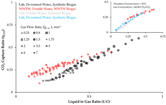 The inlet biogas pressure fixed the gas flow rate to the HFMC, which measured between 10 mBar (QG, 3.5 L min−1) and 33 mBar (QG, 7 L min−1). For these gas flow rates, the practicable liquid flow rate range was between 0.5 and 9.5 L min−1 corresponding to a liquid-to-gas ratio (L/G ratio) of between 0.2 and 2.7 (Figure 2). The CO2 capture ratio (ηCO2) was characterised on-site for prefiltered biogas using potable water as the absorption solvent (Figure 2). As the L/G was increased, an increase in ηCO2 was determined. This was comparable to the response observed for synthetic biogas, but a higher ηCO2 was determined on-site for prefiltered biogas when compared over the same operating range. The average absorbent temperature was 14 °C when on-site, compared to 20 °C when in the laboratory. Consequently, a discrete dataset collected on-site for an absorbent temperature of 20 °C was compared to laboratory data (Figure 2, Inset). A t-test for independent samples yielded t = 0.7, which was markedly below tcritical (2.1, p-value 0.5), indicating data from real and synthetic biogas is comparable.