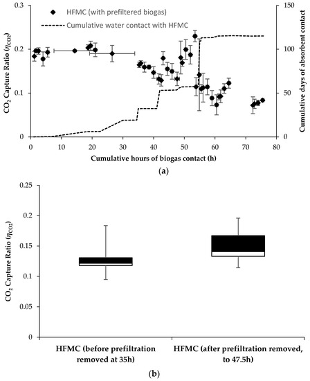 Long-term CO2 separation performance for biomethane production from HFMC technology using potable water: (a) with prefiltration; and (b) comparing ηCO2 before and after prefilter removal. For (a) x-axis error bars are the time period over which the data is collected; y-axis is the mean and standard deviation of ηCO2 over the discrete period measured. For (b) box edges, 25th and 75th percentile; centre line, median; whiskers, min. and max.; n = 17).