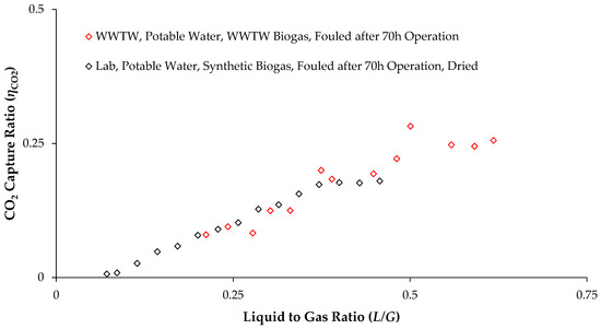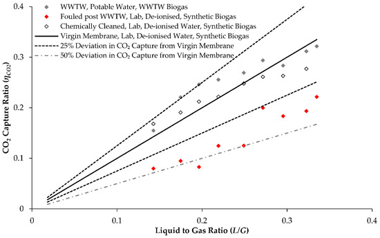 Following a reduction in ηCO2 observed on-site after 115 days operation, laboratory evaluation was undertaken to determine whether this could be accounted for by condensation mechanisms on the gas side, where gas moisture content for the inlet biogas approached the dewpoint (~17–19.7 g m−3). The fouled membrane was dried by passing 90 L of CO2 through the fibre lumen and then subjected to the same hydrodynamic conditions as used on-site, but using synthetic biogas of equivalent concentration (an industrially dry gas) and potable water as the solvent (Figure 4). Comparison of the fouled membrane under site conditions with operation on synthetic biogas demonstrated comparable ηCO2, which confirmed a change in module performance rather than gas-phase capillary wetting to be the dominant mechanism for the decline on CO2 separation efficiency.