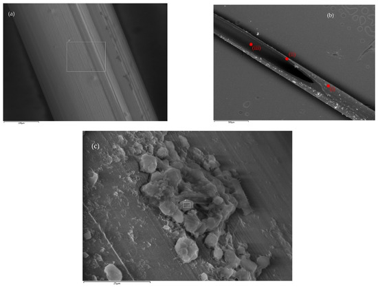 Field emission scanning electron microscopy of fibres extracted from HFMC modules: (a) virgin fibre exposed to synthetic biogas and potable water only; (b) fouled fibre—(i) fibre shell-side, (ii) fibre wall, (iii) fibre lumen-side; (c) shell side of fouled fibres using high magnification image (25 µm scale) to evidence extensive shell-side fibre surface fouling.