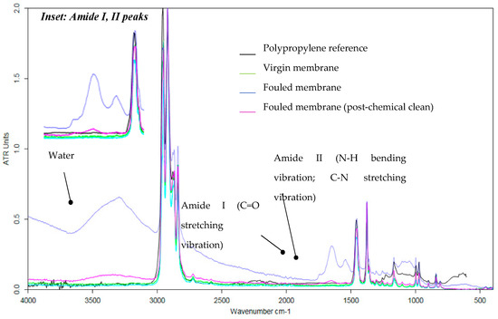 Detailed foulant characterisation was first undertaken using ESEM, where the lumen-side and shell-side of the membrane were both inspected (Figure 5). No particle deposition was evident within the hollow-fibre lumen (example Figure 5b(iii)) where biogas was introduced. This is supported by the FTIR spectra (Figure 6) where no evidence for the adsorption of siloxanes (Si-O bond, 1150–1000 cm−1), carbon disulphide (C-S bond, 700–600 cm−1), or aromatic hydrocarbons was evidenced (C-H bond, 900–690 cm−1) [33]. However, considerable deposition was noted on the shell-side of the hollow fibre membranes, where the absorbent circulated (Figure 5).