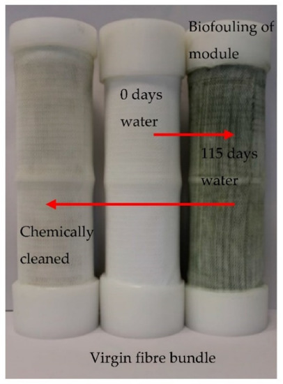 FTIR analysis of the surface deposition (Figure 6) evidenced two peaks that were distinct from the virgin membrane, and polypropylene reference standards at 1540 cm−1 and 1650 cm−1, which are coincident with the amide II and amide I bands respectively, which are two major bands of the infrared protein spectrum. The amide I band is often associated with C=O bond, which relates to backbone conformation of the protein, whilst amide II is indicative of N-H bending and C-N stretching vibration [34]. This is indicative of organic biofouling of the shell-side. To support this assertion, the turbidity of absorbent used for the HFMC (after five days storage) had a turbidity of 29 NTU, compared to potable water stored for the same period that had not been used for biogas upgrading (1.4 NTU), and is complemented by the visual evidence of a green biofouling layer formed at the membrane-absorbent interface (Figure 7). The impact of biofouling on CO2 separation performance was evidenced by comparing ηCO2 data from the virgin HFMC first operated on real biogas for biogas upgrading, to that of a virgin HFMC operated on synthetic biogas and finally, HFMC data following 115 days operation (with prefiltration) (Figure 8). The fouled HFMC records ηCO2 between 25% and 50% of the virgin HFMC (Figure 8). However, once subject to one chemical cleaning intervention of the shell-side, a visible reduction in biofouling was evident (Figure 7). Efficacy of the chemical clean was confirmed by FTIR analysis of the chemically cleaned fibres, which indicated an absence of the amide I and amide II peaks, associated with protein fouling. The impact of this focused intervention (Figure 8) illustrated that it was possible to recover to the expected ηCO2 using chemical cleaning to target biofouling.