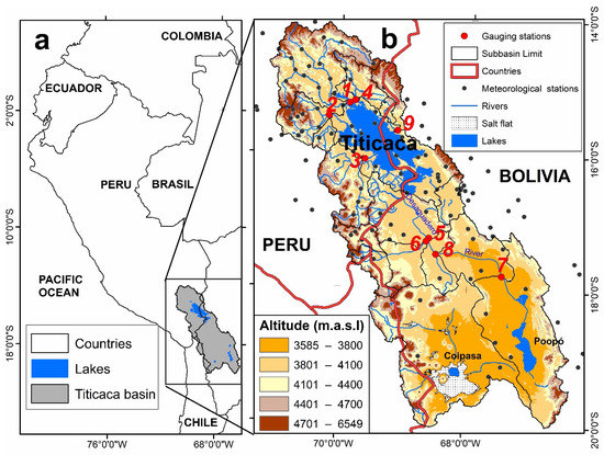Figure 1. (a) Location of the Lake Titicaca, Desaguadero River, and Lake Poopo basins (TDPS system) in South America (b) TDPS, gauging stations (red dots), rainfall, and/or temperature stations (black dots).