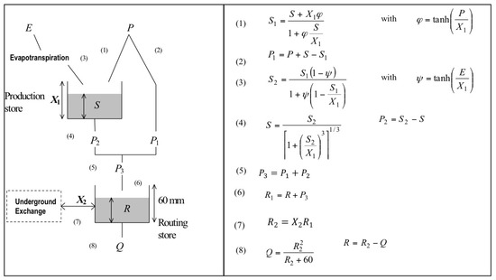 Figure 2. GR2M model scheme, describing precipitation (P), Evapotranspiration (E), water storage of the (S) reservoir, the precipitation that enters the soil (P1), the amount of water that contributes (Table 2), the effective precipitation (P3) and the gravitational water reservoir (R), the capacity of the reservoir-soil in mm (X1), the coefficient of groundwater exchange (X2), and runoff (Q) [62]. Source: CEMAGREF (www.cenagref.fr).