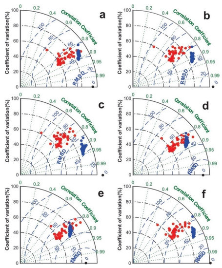 Figure 3. Taylor diagrams displaying a statistical comparison for precipitation datasets (coefficient of variation (%), the root mean square deviation RMSD (%) and the correlation coefficient) between climate models with bias correction and climate models without bias correction (blue and red dots, respectively) for six basins controlled at the following stations: (a) Ramis, (b) Unocolla, (c) Ilave (located in Peru), and (d) Chuquiña, (e) Calacoto Maure, (f) Calacoto Desaguadero (located in Bolivia), for the 1984–2014 period.