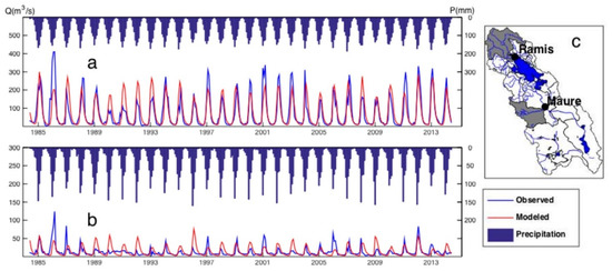 Figure 6. Observed and modeled streamflow hydrographs between 1984 and 2014 at (a) Ramis and (b) Calacoto Maure stations. (c) Location of Ramis and Maure river sub-basins controlled at the Ramis and Maure stations are indicated on the map.