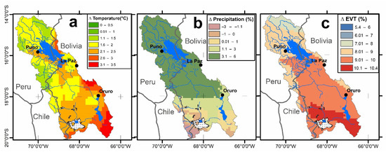 Warming in the 0.5–3.5 °C range is observed in Figure 7a, with the largest temperature rise occurring in the southeastern and the smallest one in the northwestern TDPS (0.5−1.5 °C). According to model projections, the northern and central TDPS will experience a slight increase of 3–6% in future annual precipitation (Figure 7b), while a decrease of up to ~3% is expected in the southern TDPS in Bolivia (Figure 7b). The spatial distribution of ET changes was similar to that of temperature changes: from a 5–8% increase in evapotranspiration in the northern TDPS to 8–10% in the southern zone (Figure 7c).