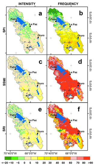 In the central Andes, the rainy season occurs in the austral summer and the dry season in winter. The seasonality is even stronger and the wet season is shorter in the Altiplano region [18,21]. The choice of timescale was related to the objectives to be achieved [85]. The one-month time scale was applied to every one of the SPI, SSMI, and SRI indices given that seasonality, the semiarid climate, and the fact that even 1-month long droughts during the rainy onset (September–November) and wet (December–April) seasons have serious impacts on crop yields in the Altiplano [86], thus requiring meteorological and agricultural droughts to be analyzed at a detailed time resolution. Hydrological droughts, which are usually studied at longer time scales, were examined also at the 1-month time scale for comparison.
