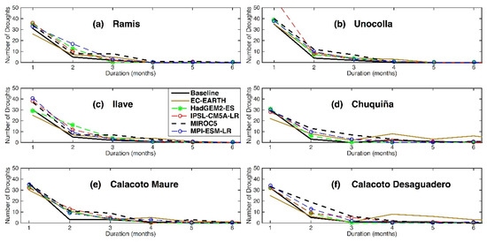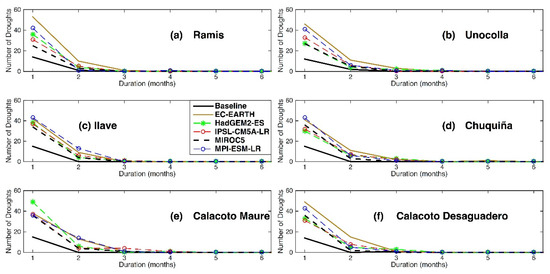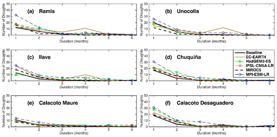 Figure 10. Frequency of agricultural droughts according to their duration. Results for baseline and futures scenarios defined by five selected GCM are shown for six sub-basins controlled at the following stations: (a) Ramis (1), (b) Unocolla (2), (c) Ilave (3), in Peru, and (d) Chuquiña (7), (e) Calacoto Maure (6), (f) Calacoto Desaguadero (5), in Bolivia. Numbers in parentheses indicate the location of control points in Figure 1b.