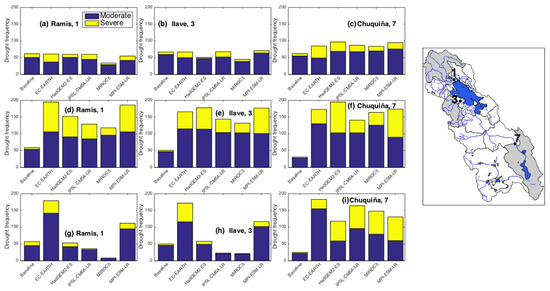 Figure 12. Total number of drought months (frequency, y-axis) of meteorological (ac), agricultural (df), and hydrological (gi) droughts for the future period (2034–2064) in comparison to the baseline period (1984–2014). Results for five future GCM scenarios for three selected sub-basins controlled at the Ramis (1), Ilave (3), and Chuquiña (7) stations are shown. Numbers in parentheses indicate the location of the control points in the map.
