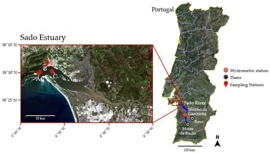 Location of the Sado estuary, within the Portuguese territory, and of the 3 sampling stations presented in this study. Representation of the main Sado river course in blue, as well as Moinho da Gamitinha station and Monte da Rocha and Roxo dams.