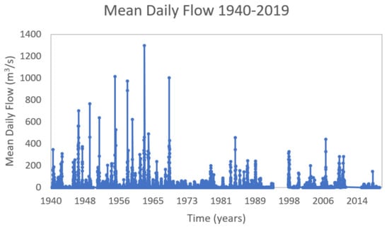 Daily average outflow of the Sado river, in the period between 16 October 1940 and 31 December 2019, measured at the Moinho da Gamitinha station (from SNIRH; https://snirh.apambiente.pt/).
