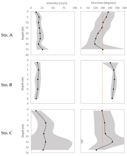 The following are available online at https://www.mdpi.com/2073-4441/13/2/187/s1, Table S1: Dataset on profile measurements of intensity and direction of the currents collected during the sampling period in stn. A, Table S2: Dataset on temperature (T) and salinity (S) profile measurements collected during the sampling period in stn. A. The values which were not collected at those particular depths and were computed as the average between the respective upper and lower values are represented in red, Table S3: Dataset on profile measurements of intensity and direction of the currents collected during the sampling period in stn. B, Table S4: Dataset on temperature (T) and salinity (S) profile measurements collected during the sampling period in stn. B The values which were not collected at those particular depths and were computed as the average between the respective upper and lower values are represented in red, Table S5: Dataset on profile measurements of intensity and direction of the currents collected during the sampling period in stn. C, Table S6: Dataset on temperature (T) and salinity (S) profile measurements collected during the sampling period in stn. C. The values which were not collected at those particular depths and were computed as the average between the respective upper and lower values are represented in red.