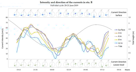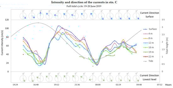 During the campaigns covering the whole tidal cycle (20–21 June 2019 and 19–20 June 2019), measurements were taken every 30 min, at several depths: every 4 m at stn. B and every 3 m depth at stn. C. The boat was anchored during the whole sampling period.